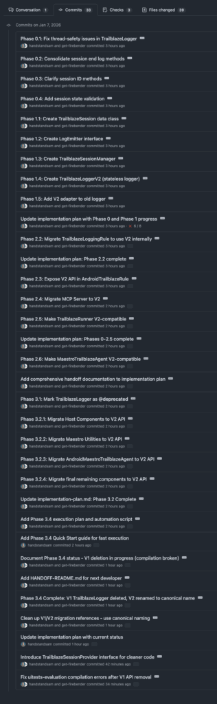 Trailblaze (UI Test Automation Framework) originally was just used in JUnit tests, but we have added the ability to run tests via our desktop application. This meant we needed common functionality in both places, but we had just put the existing code that was meant to be used during JUnit test lifecycle and make it work in the Desktop app. While that’s great that it worked, the code that is there now is pretty convoluted, so I’m using this strategy to untangle it. It ends up being a lot of small commits, but it’s easier to see what happened myself and for the agent. At the end I just review the final PR like I would by looking at the final changed files, and give feedback based on that. Right now these are the commits in that PR so far 😲